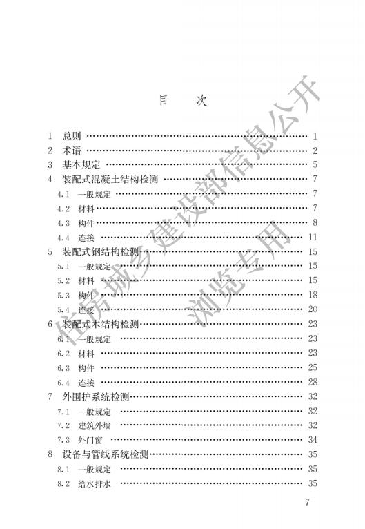 除總則、術(shù)語(yǔ)、基本規(guī)定外,標(biāo)準(zhǔn)還對(duì)裝配式混凝土結(jié)構(gòu)檢測(cè)、裝配式鋼結(jié)構(gòu)檢、裝配式木結(jié)構(gòu)檢測(cè)、外圍護(hù)系統(tǒng)檢測(cè)、設(shè)備與管線系統(tǒng)檢等作出了明確的規(guī)定。